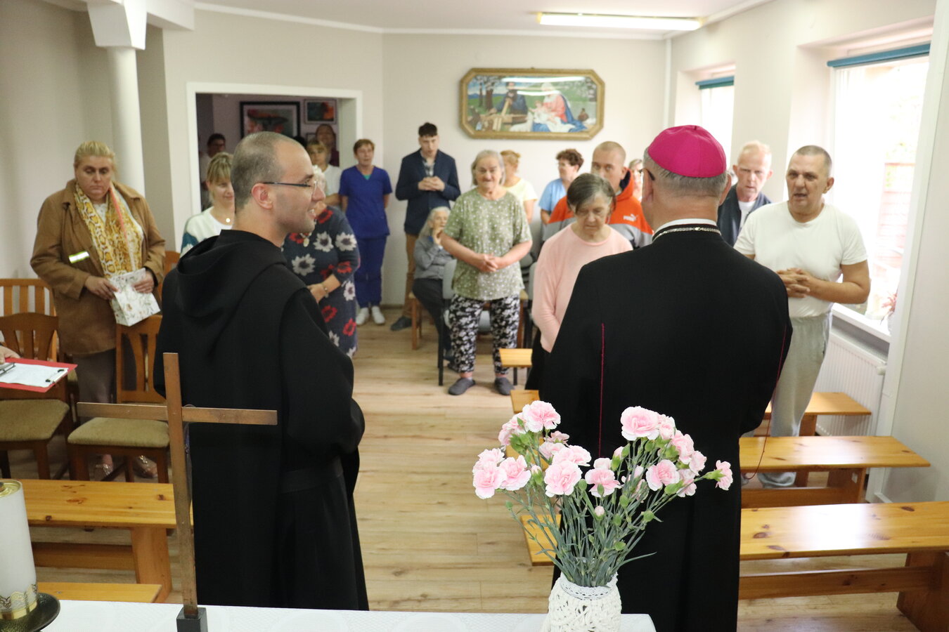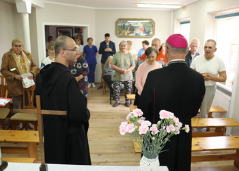 W kaplicy mieliśmy zaszczyt gościć biskupa Jana Glapiaka, który odwiedził nas w ramach wizyty duszpasterskiej. Była to okazja do wspólnej modlitwy, rozmowy i dzielenia się radością wiary. W trakcie spotkania w kaplicy, jeden z naszych mieszkańców, pan Roman, wygłosił wzruszające przemówienie. Przemówienie to zostało specjalnie przygotowane na tę okazję przez pana Romana.. Na zakończenie spotkania, biskup otrzymał od nas prezent - który został wykonany przez mieszkańców podczas terapii zajęciowej. Był to wyraz naszej wdzięczności i szacunku dla naszego gościa.